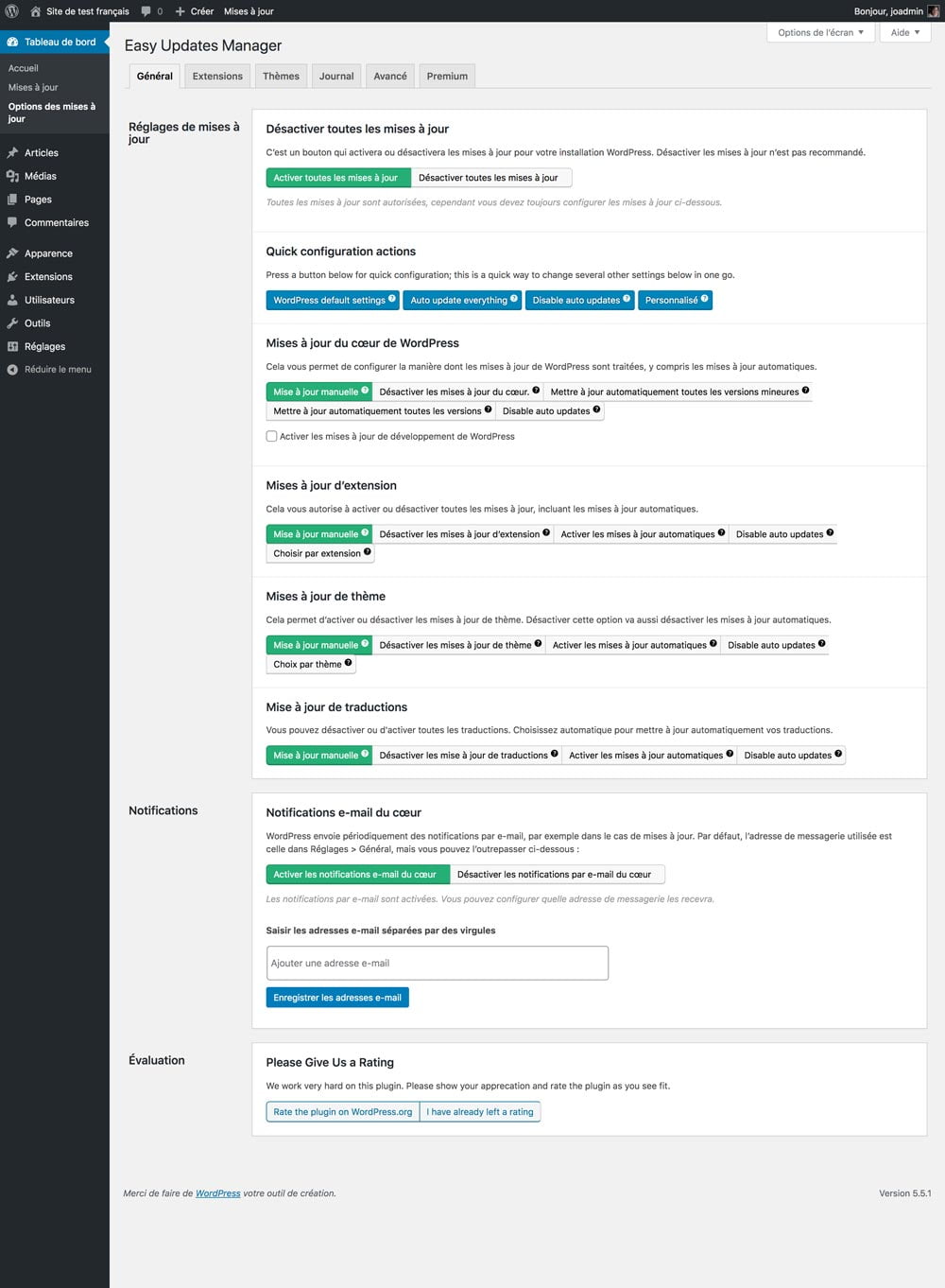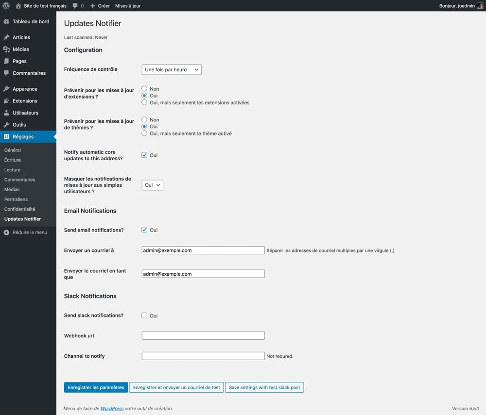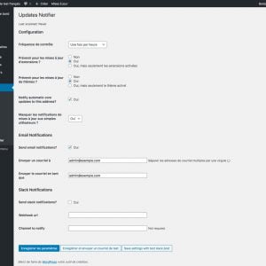 Par défaut, il vérifie les mises à jour principales de WordPress, les mises à jour des extension et les mises à jour des thèmes. Tout ce que vous avez à faire est de cliquer sur enregistrer les paramètres avec le bouton courriel de test.